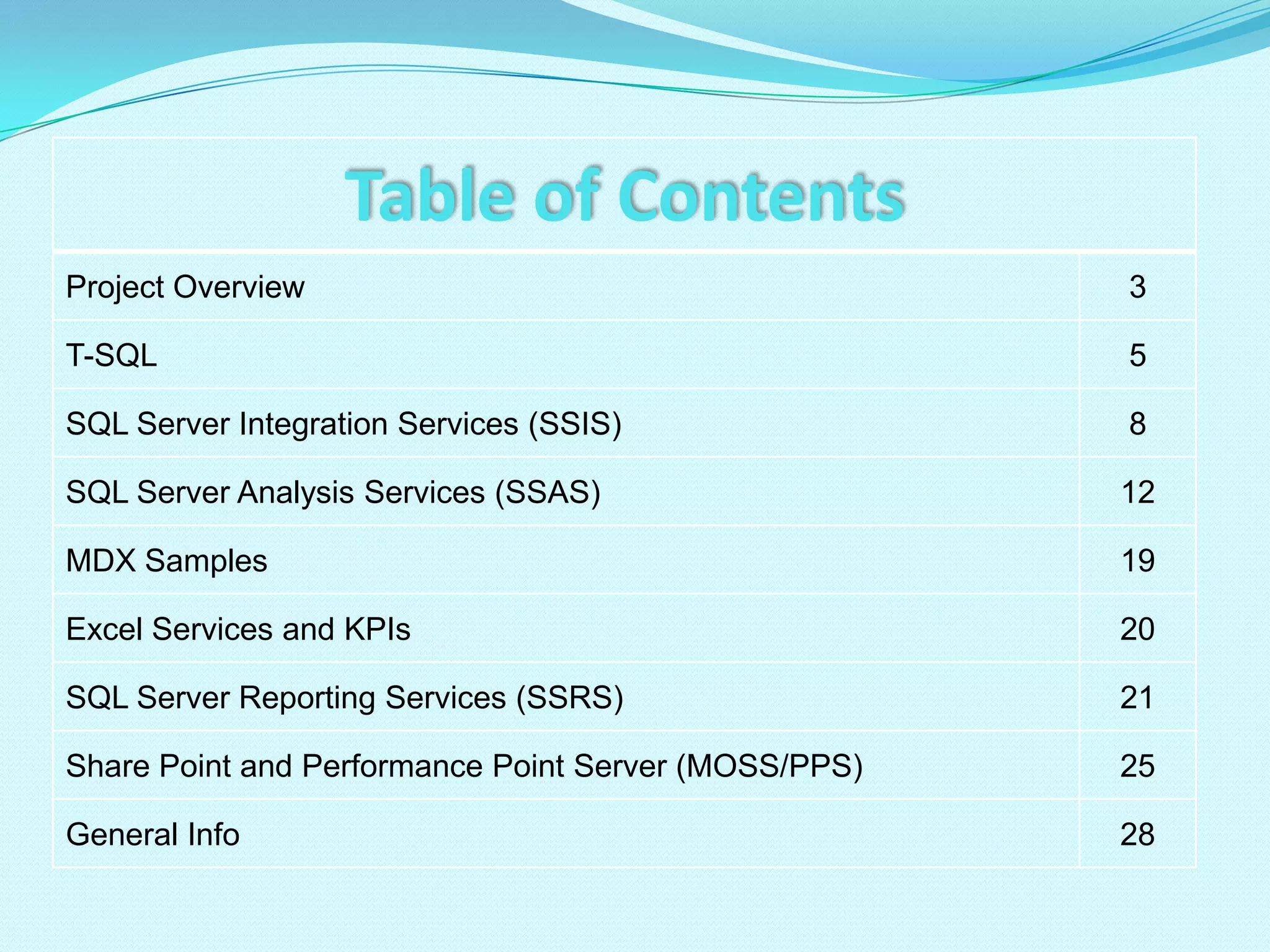This document summarizes a portfolio of business intelligence projects completed using Microsoft technologies including SQL Server, SSIS, SSAS, SSRS, Excel Services and SharePoint. The portfolio contains samples from projects that involved designing a star schema, building an ETL solution to load data from multiple sources into SQL Server, creating an OLAP cube with dimensions and hierarchies, writing MDX queries and SSRS reports, and publishing dashboards, reports and charts to SharePoint using Performance Point Server. The portfolio demonstrates over 500 hours of hands-on experience with these Microsoft BI technologies approximating over 2 years of work experience.
