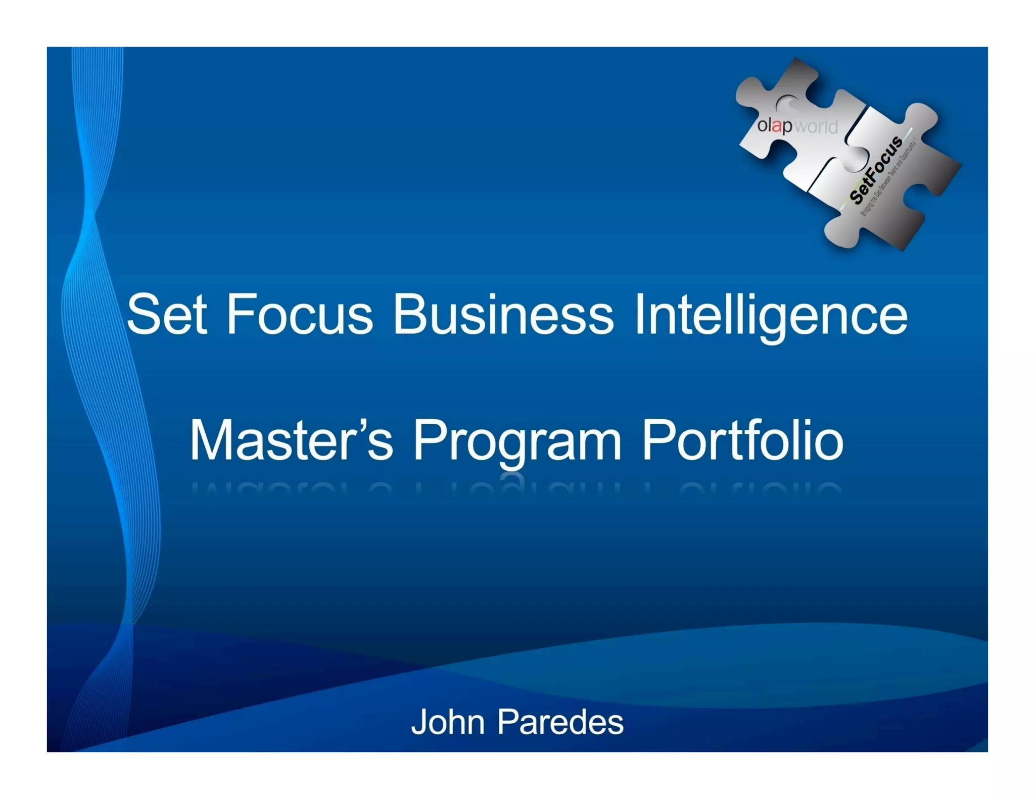 This portfolio showcases the author's work during the ten-week Business Intelligence Masters program at SetFocus, covering comprehensive Microsoft BI product components including SSIS, SSRS, and SSAS. It outlines the program's objectives such as creating a dimensional data warehouse, generating reports, and developing OLAP databases, along with detailed processes for data integration, cleansing, and reporting. The document includes practical demonstrations of building ETL processes, designing interactive reports, and creating analysis services databases using SQL Server tools.