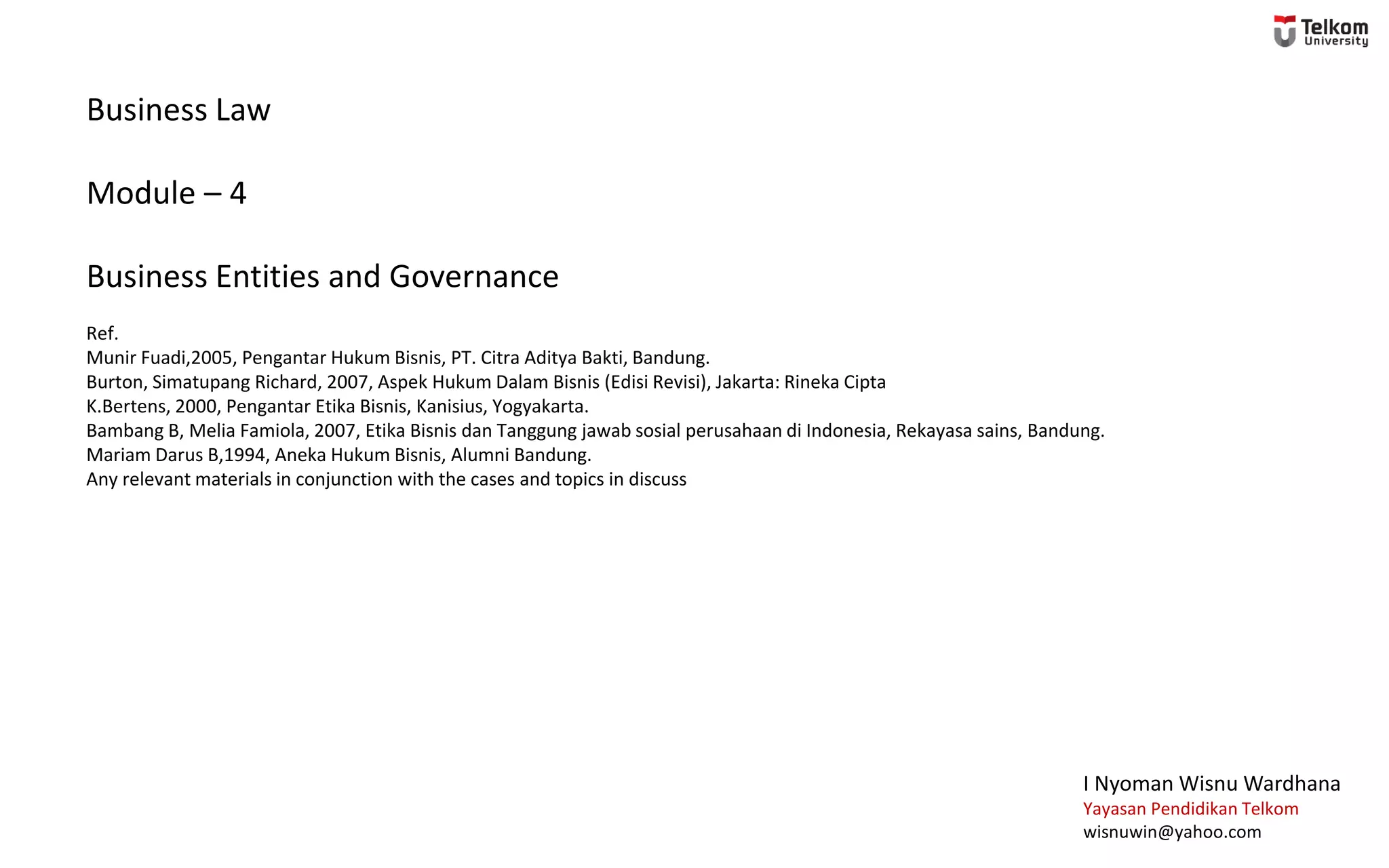 Dokumen ini menjelaskan berbagai bentuk entitas bisnis dan tata kelola di Indonesia, termasuk perusahaan perseorangan, persekutuan, dan perseroan terbatas. Ini juga menjelaskan dasar hukum, keuntungan dan kerugian masing-masing entitas, serta peran dan tanggung jawab pemangku kepentingan dalam badan hukum. Tata kelola bisnis berfokus pada tindakan dan pengawasan manajemen terhadap hak-hak pemegang saham dan kepatuhan terhadap norma-norma yang berlaku.