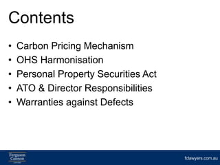 The document outlines key business legislative updates for 2012, including the carbon pricing mechanism affecting certain industries, the new workplace health and safety harmonization laws, and the implications of the Personal Property Securities Act. Directors have new responsibilities for compliance and personal liability, while warranties against defects must align with Australian consumer law. Recommendations for businesses include reviewing compliance practices and engaging experts for assurance.