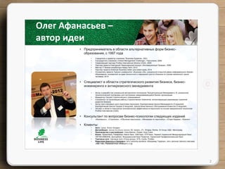 Документ описывает концепцию образовательной эко-системы 'business life', созданной Олегом Афанасьевым для практической подготовки специалистов в сфере бизнеса. Система предлагает различные программные модули для разных групп, включая студентов, менеджеров и предпринимателей, с акцентом на личностный и карьерный рост. Кроме того, документ перечисляет достижения автора и его вклад в развитие бизнес-образования и подготовки кадров.
