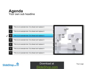 The document appears to be a template presentation with placeholder text and various sections intended for customization. It includes an agenda, editable diagrams, and instructions to replace example text with original content. The document emphasizes the use of templates for creating presentations and encourages users to download from slideshop.com.