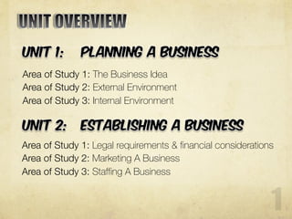 This document discusses factors to consider when evaluating a potential business opportunity. It identifies sources of business inspiration including innovation, recognizing market opportunities, changing customer needs, and new technologies. Personal motivation for starting a business and skills/qualities of successful entrepreneurs are also examined. Students will learn to identify business opportunities, apply management concepts, and research case studies. Key decisions that must be made prior to starting a business include evaluating personal suitability and identifying the business concept.