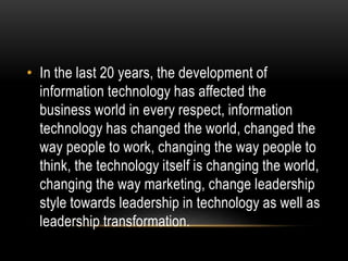The document discusses how changes in information technology have dramatically changed business over the last 20 years. It states that change is now constant and that business models must constantly evolve to keep up with new trends, customer behaviors, technologies, and market dynamics. Companies must continuously innovate, study changes and their impacts, and develop new strategies to create value for customers and remain competitive. The only constant in business is change, and business leaders must adapt their models and thinking in order to survive and succeed in this rapidly changing environment.