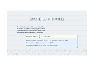 1) How to convert a fraction to a percentage by dividing the top number by the bottom number and multiplying by 100, or multiplying the top number by 100 first and then dividing by the bottom number.