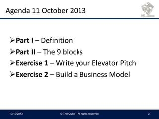 This document outlines an agenda for two days of training on business model canvas. Day one covers defining the business model, the nine blocks of the canvas including value proposition, customer segments, and revenue streams. Participants do exercises to write an elevator pitch and build an initial business model. Day two covers example business models and has participants further develop their own canvas models and get feedback. The overall goal is to help participants understand and apply the business model canvas tool to their own startup or business ideas.