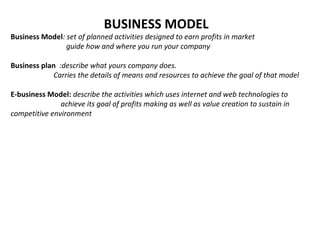 The document defines business models and their key components. It discusses traditional business models and e-commerce models. For business models, it identifies the main components as the value proposition, target customers, distribution channels, customer relationships, revenue streams, resources, activities, and cost structure. For e-commerce models, it provides examples of revenue streams like advertising, subscriptions, transactions, and sales. It also discusses the value proposition, target market segments, competitive environment, market strategy, and customer relationship management as important components of e-commerce models.