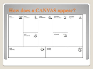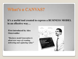 Il Business Model Canvas è uno strumento grafico ideato da Alex Osterwalder per rappresentare in modo efficace i modelli di business, evidenziando come un'azienda crea, distribuisce e cattura valore. Il canvas è composto da diversi elementi chiave, tra cui proposta di valore, segmenti di clientela, canali, relazioni con i clienti, flussi di entrate, attività chiave, risorse chiave, partner chiave e struttura dei costi. Questo strumento aiuta le aziende a pianificare e comunicare le loro strategie in modo semplice e conciso.