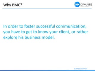 The document outlines the Business Model Canvas (BMC) as a strategic tool for understanding a company's business model through key areas such as customer segments, value propositions, channels, and revenue streams. It emphasizes the importance of identifying customer needs, company resources, and activities to achieve effective communication with clients. The BMC is highlighted as a transparent method to gain insights into customer values and channels during project initiation.