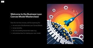 The Business Lean Canvas Model Masterclass introduces a strategic tool for entrepreneurs to visualize and develop business ideas through nine key building blocks. It emphasizes benefits like rapid testing and iteration of business models, enabling identification of flaws before significant investment. The process involves understanding customer needs and refining ideas through feedback.