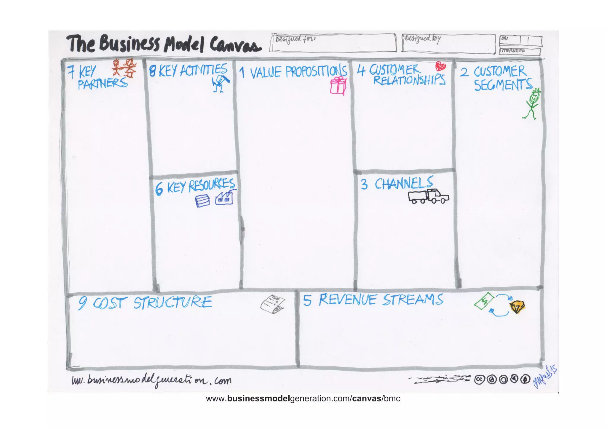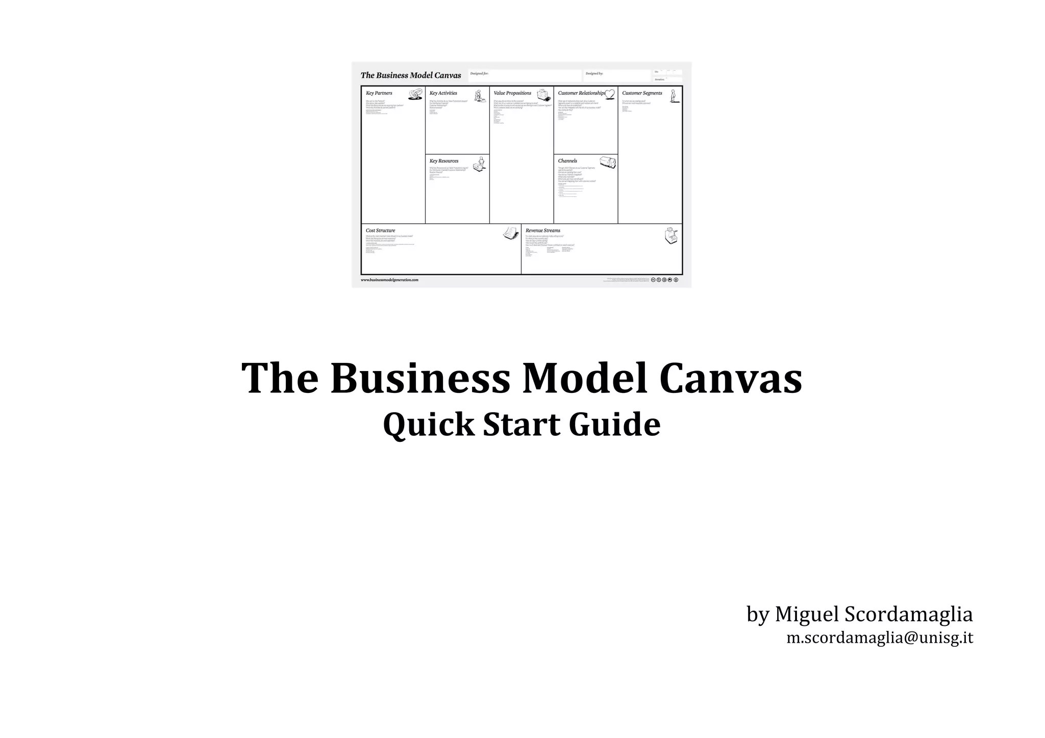 The document is a quick start guide for the Business Model Canvas by Miguel Scordamaglia. It introduces the Business Model Canvas as a tool for developing business models and outlines its nine building blocks: key partners, key activities, key resources, value propositions, customer relationships, channels, customer segments, cost structure, and revenue streams. It provides references and further reading materials about business model generation and the lean startup methodology.