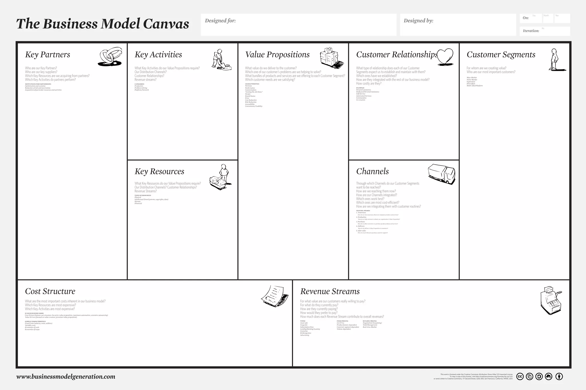 The document is a template for a business model canvas. It outlines the key elements of a business model including key partners, activities, value propositions, customer relationships, customer segments, key resources, and revenue streams. It is designed to help map out the core aspects of how a business is run and what value it provides customers.