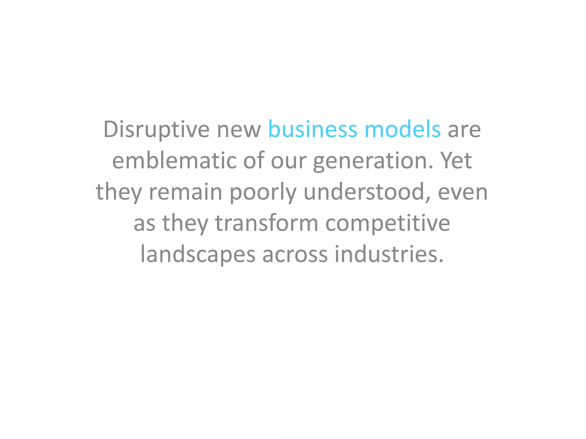 Disruptive new business models are emblematic of our generation yet remain poorly understood, even as they transform competitive landscapes across industries. In 3 sentences: New business models are defining current entrepreneurship but are still not well understood despite reshaping competition in many fields. These emerging models challenge traditional ways of doing business but the full impact is only starting to be recognized as they spread to different sectors. More research is needed to comprehend these innovative approaches and their effects on established companies.