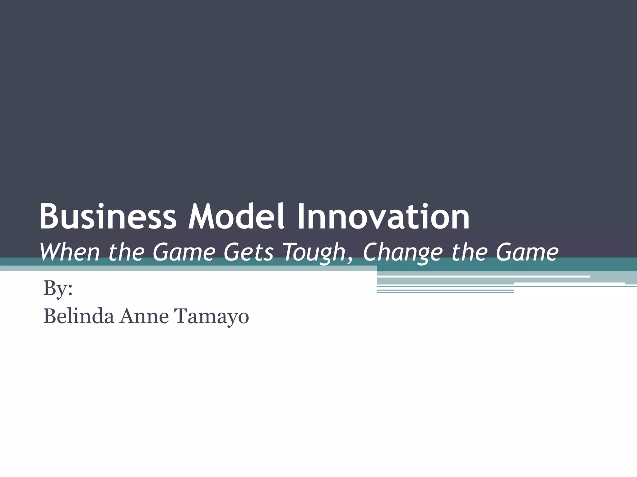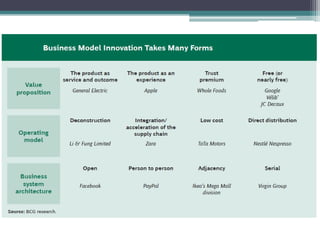 This document discusses business model innovation (BMI). It defines BMI as reinventing a business itself by innovating two or more elements of its business model to deliver value in a new way. The document then covers the evolution of BMI principles, the relevance of BMI today to address disruption and competition, challenges companies may face with BMI like failure to scale up ideas, and provides examples of companies like Apple and Ikea that successfully applied BMI.