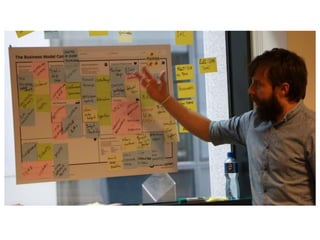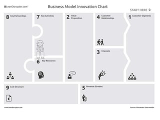 This document discusses business model innovation and the business model canvas. It provides various resources for learning about business models, including books, online courses, videos, and templates. It then explains the nine building blocks of the business model canvas - key partnerships, key activities, key resources, value propositions, customer relationships, channels, customer segments, revenue streams, and cost structure. Each block is defined and an example of filling out a business model canvas for a farm business is provided. The document encourages the reader to draw their own business model canvas and fill it out with ideas and hypotheses.