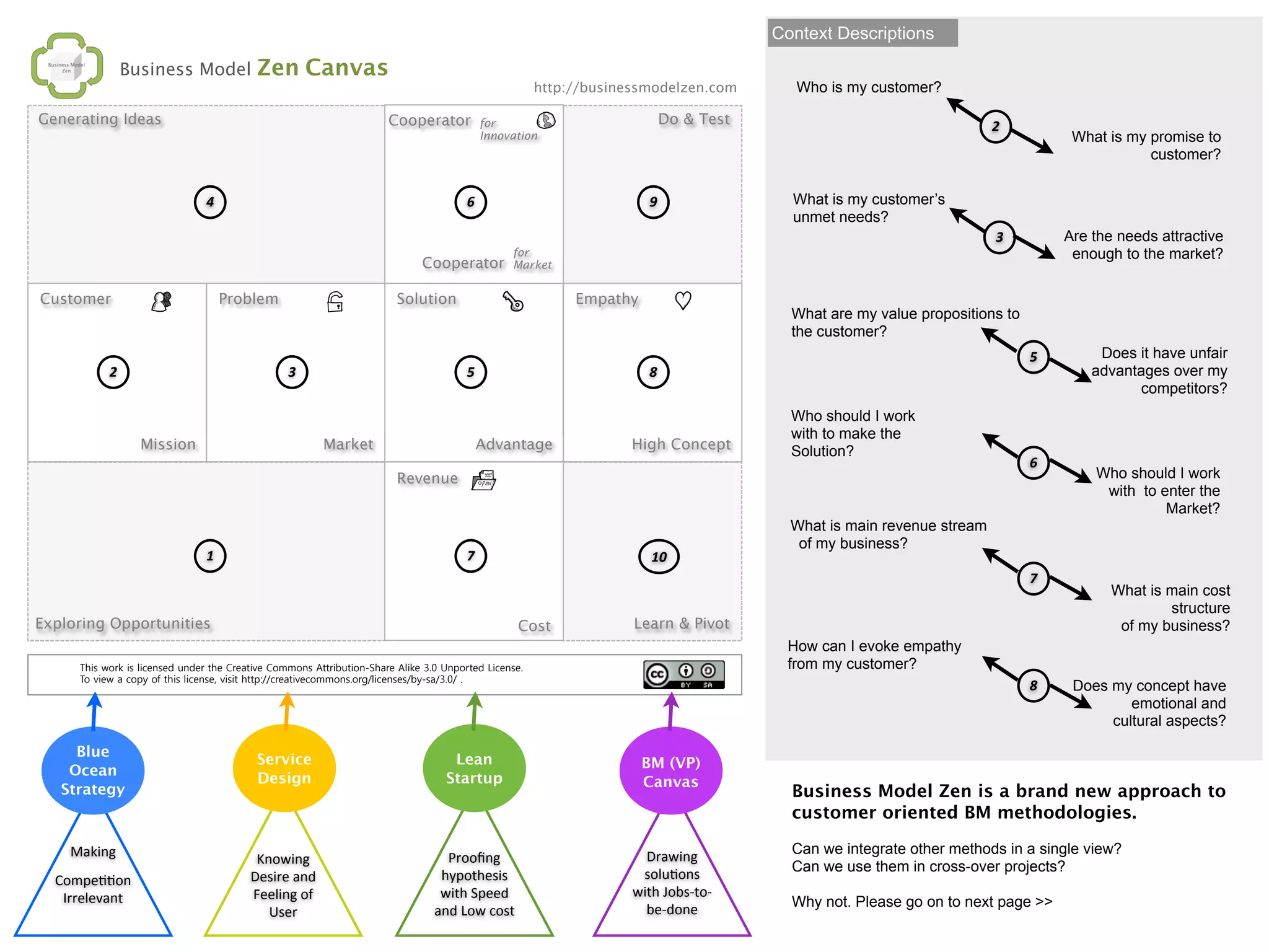 The document introduces the concept of the Business Model Cube and associated methodologies like Blue Ocean Strategy, Lean Startup, and Service Design while emphasizing the importance of simplicity in business modeling. It outlines frameworks for generating business ideas, understanding customer needs, and testing innovations. Additionally, it presents a structured approach for diagnosing and empowering business models through the Business Model Zen Canvas and related tools.