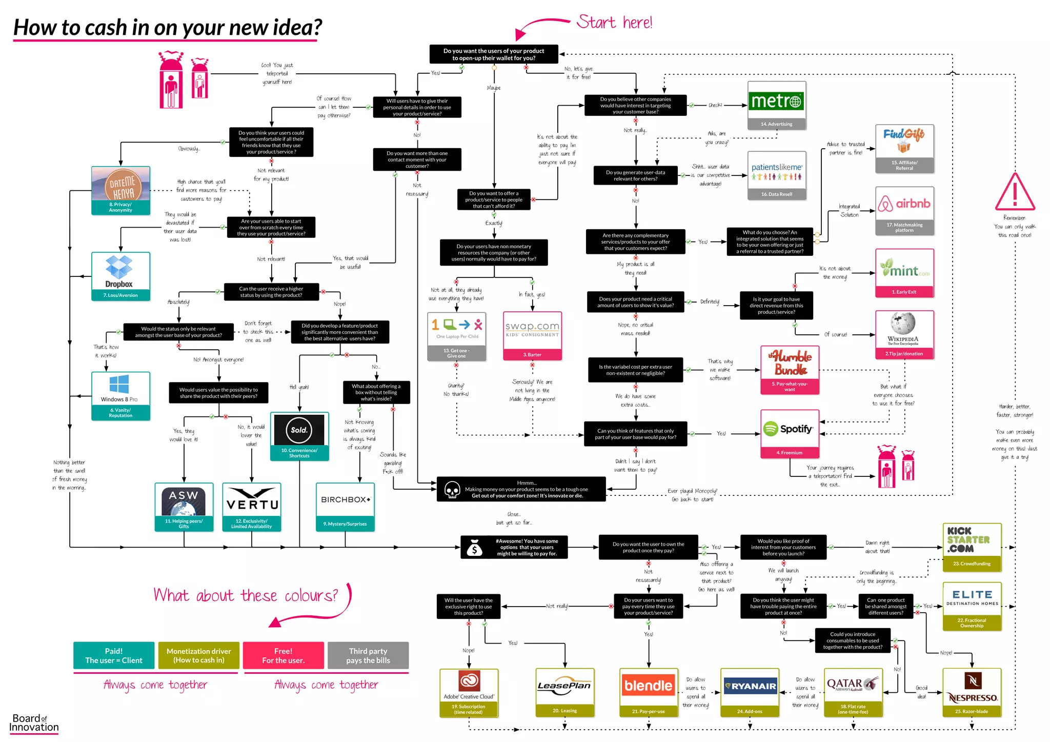 The document discusses various monetization strategies and business models for a product or service, including direct user payments, freemium models, subscriptions, advertising, data reselling, affiliate marketing, and others. It poses a series of questions to help determine which strategies may be suitable and how to implement them effectively.