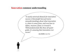 This document discusses business model innovation and provides definitions and frameworks for understanding business models. It begins by defining innovation and discussing challenges with innovating. It then presents frameworks for analyzing different dimensions of a business model, including offerings, delivery, processes, and the overall business model. Key components of the business model canvas framework are outlined, including customer segments, value propositions, channels, customer relationships, revenue streams, resources, activities, partnerships, and cost structure. The document emphasizes exploring opportunities outside current markets and focusing on a company's core competencies for strategic innovation. It provides examples of business model innovation from various industries.