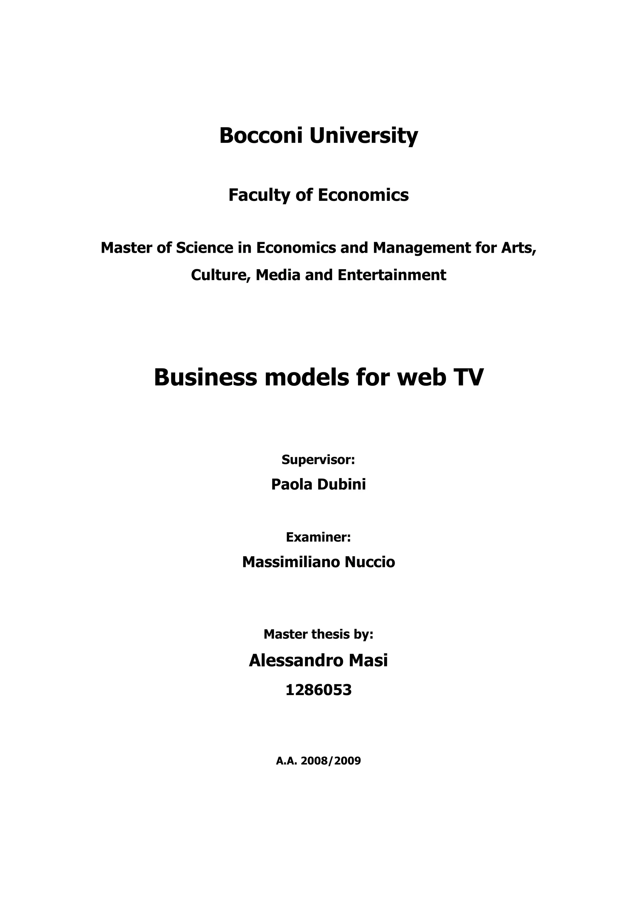 The thesis explores the business models for web TV, aiming to identify sustainable approaches amidst its growing audience and investment opportunities. It differentiates web TV from IPTV, emphasizing user-generated content and a variety of revenue streams, mainly through advertising. Through statistical analysis and case studies, the research provides insights into the strategic variables determining successful web TV operations.