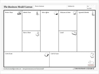 Il documento discute il concetto di modello di business, analizzando i suoi elementi fondamentali e la struttura del 'business model canvas' di Alexander Osterwalder. I nove elementi centrali includono clienti, valore offerto, attività chiave, risorse chiave, partner, relazioni, canali, costi e ricavi. È disponibile un link per scaricare il 'business model canvas' in italiano e in inglese.