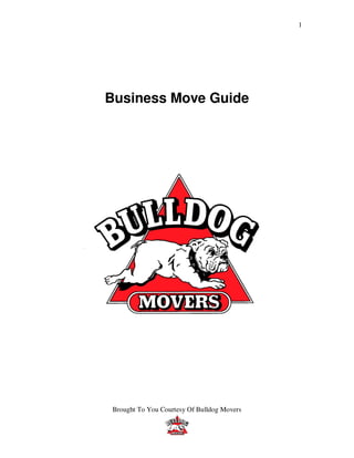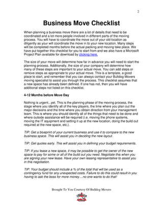 The document provides a detailed checklist and timeline for planning a business move over 12 months, including coordinating the logistics of the move out and move in, preparing employees, packing and labeling inventory, setting up the new space, and executing the move day. It emphasizes communication, budgeting, defining responsibilities, and preparation in order to make the move seamless for customers and employees. Key tasks are broken down by time period starting 12 months before the move and continuing to the move day.