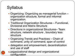 This document discusses organizing as a managerial function and different organization structures. It covers traditional structures like functional, divisional, and matrix structures. It also discusses trends like team structures, network structures, and boundaryless structures. Key aspects of organizing covered include departmentalization, chain of command, span of control, and delegation. Traditional and informal organization structures are defined and compared.