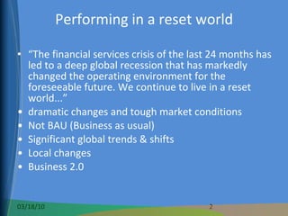 The document discusses the changing business environment and need for companies to adapt to major global trends and shifts. It notes dramatic changes in areas like technology, markets, operations, and talent management. It emphasizes that the financial crisis created a "reset world" requiring recalibration of competitive strategies. Companies must consider challenges like new regulations, customer needs, social media impact, and talent retention to survive in this complex operating environment.