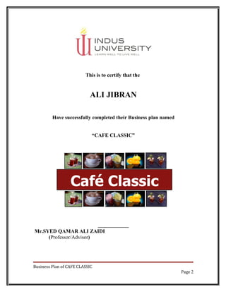 The document outlines a business plan for Café Classic, a new sheesha and coffee house to be opened in Defense Phase II, Karachi. Café Classic will offer specialty coffee, tea, juices, kava and sheesha flavors. It aims to attract customers with high quality products and an upscale Arabian interior design. The financial plan projects sales of Rs. 4.5 million in year 1, Rs. 5.5 million in year 2, and Rs. 7 million in year 3, with profits of Rs. 805,000, Rs. 1,097,000 and Rs. 1,807,000 respectively. Keys to the business's success will be exceptional product quality, good customer service and competitive