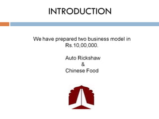 The document discusses two business opportunities: auto rickshaws and Chinese food carts. For auto rickshaws, the capital investment for 6 rickshaws is 690,000 rupees and revenue is expected to break even in 18 months. For Chinese food carts, the capital expenditure is 15,000 rupees per cart, total expected revenue per cart per year is 892,800 rupees, and expected annual profit per cart is 190,000 rupees. The business model could support around 31 employees total between operating multiple food carts.