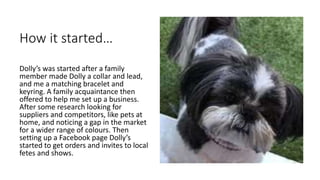 Dolly's handmakes pet accessories and training aids from paracord in a variety of colors. It started as a family project and grew through social media advertising and local events. The business aims to offer personalized products, treat customers equally, and have minimal waste. Brexit and cultural policies could impact material sourcing but may also lower costs. Advertising is done through Facebook, Instagram, and networking with other small businesses.