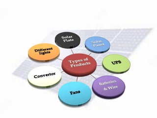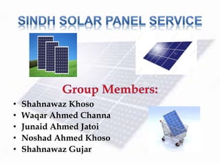 Sindh Solar Panel is a solar energy products and services company based in Pakistan. It sells branded solar panels, batteries, and other equipment to households, businesses, hospitals, and petrol pumps to provide electricity as Pakistan faces power shortages. The company has a general manager, administrative manager, finance manager, warehouse manager, and marketing manager. It sells products through retailers and works with suppliers and customers to satisfy their solar energy needs in a profitable way.