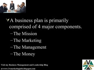 The document outlines the key components of a business plan: mission, marketing, management, and finances. It provides details on what should be included in each section such as the mission statement, descriptions of management team and their experience, market analysis, goals and objectives, and three-year financial projections. The business plan framework covers assessing opportunities and risks, addressing issues that need resolution, and including supporting documents.