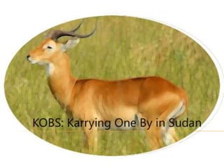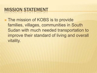 The mission of KOBS is to provide transportation to communities in South Sudan to improve living standards. Its goals are to increase education access, reduce maternal and infant mortality, and decrease water-borne diseases. KOBS will offer bike repair courses to fund bike donations to South Sudan, where literacy is low and maternal mortality is the highest in the world. It plans to market locally through social media and endorsements, becoming financially sustainable through courses and merchandise over five years of expanding operations and partnerships to further assist South Sudan.