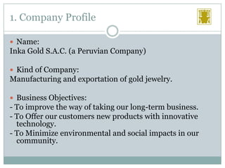 Inka Gold S.A.C. is a Peruvian manufacturing and gold jewelry export company with over 25 years of experience. Its business objectives are to improve its long-term business, offer innovative new products, and minimize environmental and social impacts. It has facilities in Lima and Ica and exports mainly to South America and Europe. Inka Gold's strengths include its expertise in rope chain production and access to gold resources. However, it faces weaknesses such as institutional barriers and low access to financing. Opportunities exist in the US and EU markets, while threats include growing competition from other countries. The company's key product is a rope chain made of tiny interlaced gold rings. It aims to export this product