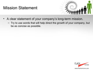 This business plan presentation template outlines the key elements to include when presenting a business plan, such as the company's mission statement, management team details, market analysis, product or service opportunities, competition, five-year goals and objectives, three-year financial projections, resource requirements, risks and rewards, and any key issues that need resolution. The template provides guidance on the type of information to present for each section to clearly communicate the company's vision, strategy, and financial expectations to stakeholders.