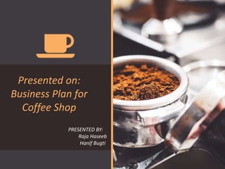 The document presents a business plan for a coffee shop called The Sip of Glory located in Islamabad, Pakistan. The executive summary introduces the coffee shop and its focus on providing a variety of coffee options and an eco-friendly environment. The situational analysis section then describes conducting market research to understand customer needs and performing a SWOT analysis. It also provides details on the project, including the location, capacity, and costs. The marketing strategy section discusses the vision, mission, target market, and advertising and promotion approaches. Finally, the financial projection section calculates the break-even point.