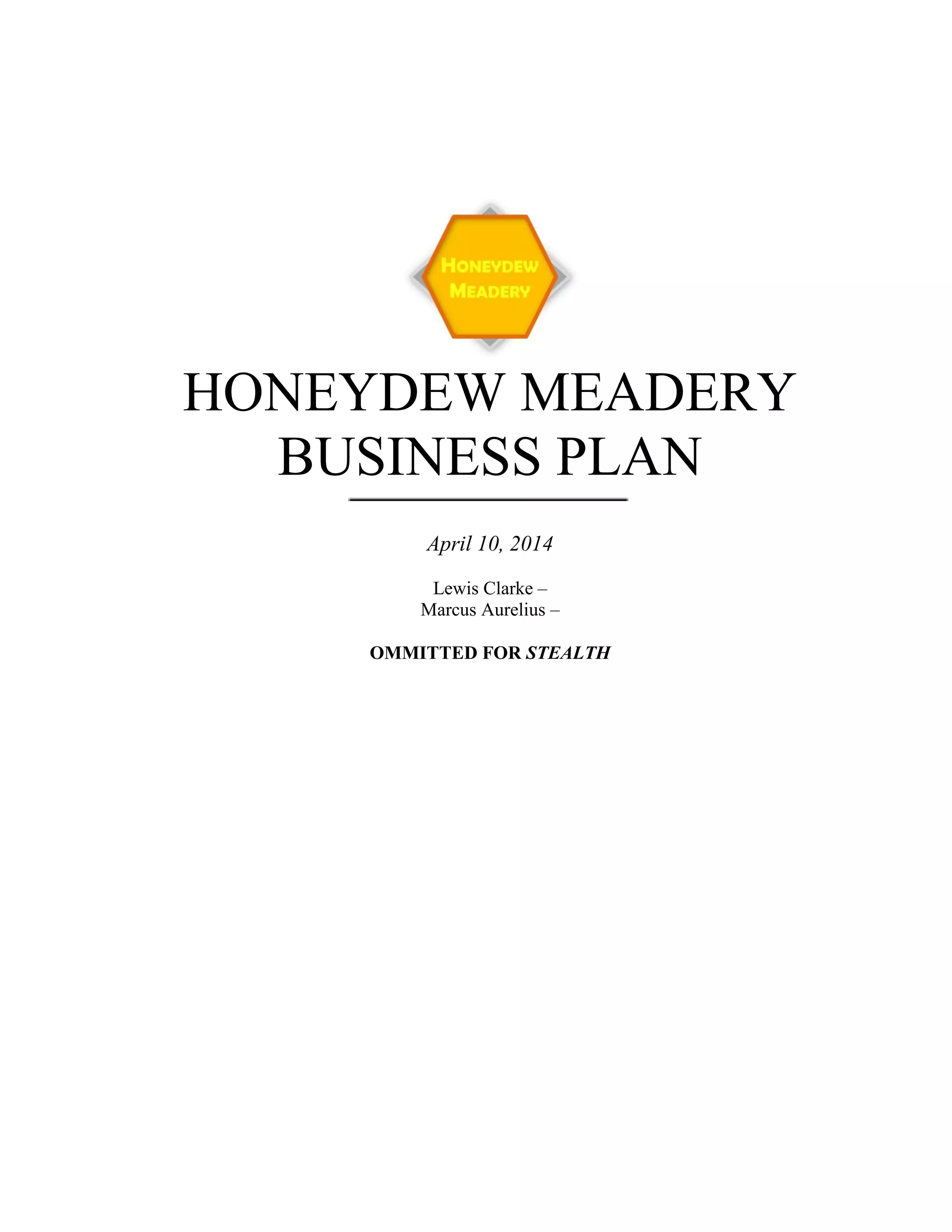 This document provides a business plan for Honeydew Meadery, a proposed mead production company. Key points include: