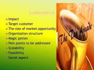 This document outlines a business plan for a specialized tea shop called Rebellion Group. It discusses targeting health-conscious customers and young people to change perceptions of tea. It details a large existing tea market in India and proposes setting up tea arcades with comfortable seating and 40+ tea varieties. The organization structure and feasible operating model are presented, along with strategies to provide a unique customer experience, scale operations profitably, and create social impact through health awareness and job opportunities.