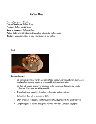 Coffee AllDay is a proposed coffee shop that will operate 24/7 in Sydney, Australia. The cafe will serve coffee, tea, snacks, and light meals. The owner's goals are to become well-known in Sydney and eventually expand throughout Australia. The business plan outlines the cafe's vision, products, target market, competition, and marketing strategy. Financial projections show increasing sales, profits, and positive cash flow over the first three years. Accounting software will be used to track finances and ensure tax compliance. The cafe aims to obtain necessary permits and operate successfully while meeting all legal requirements.
