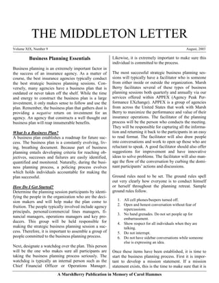 The document provides guidance on conducting effective strategic business planning for an insurance agency. It recommends identifying key participants, designating a "watchdog" to ensure the plan is followed, and using a facilitator to guide discussions. The planning process should involve analyzing the agency's current state, setting goals, and determining how to achieve those goals. Internal analysis, financial benchmarks, organizational structure, workflow, automation, and office layout are important areas to examine. Conducting open discussions through exercises can reveal strengths, weaknesses and differing perspectives to inform the planning process.