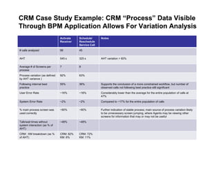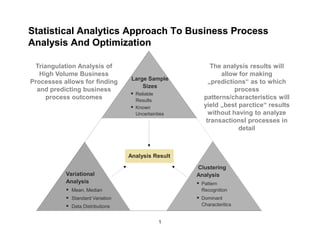The document analyzes business process performance using statistical analytics, focusing on two CRM case studies: activating a receiver and rescheduling service calls. Key findings highlight significant variations in average handling times and screen usage, with implications for user and system error rates, revealing areas for process improvement. Advanced data mining methods provided detailed insights into process clustering, distinguishing between best and poorer performing groups based on workflow characteristics.