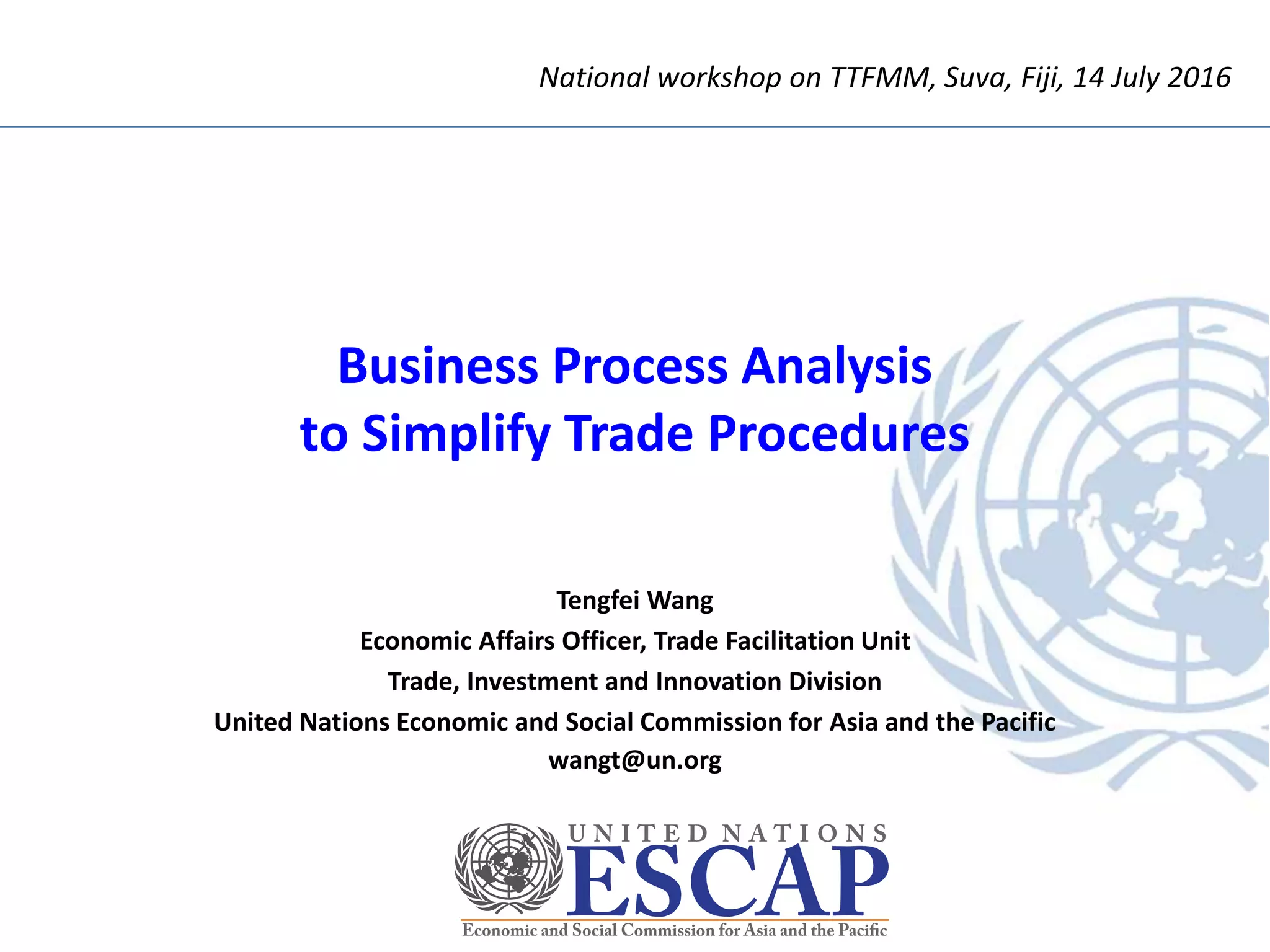 The document presents a business process analysis (BPA) approach to simplify trade procedures, highlighting its significance, benefits, and methodologies, particularly through the use of Unified Modeling Language (UML). It outlines the complexities involved in trade, including regulatory documentation and inter-agency coordination, and illustrates a case study on exporting jasmine rice from Thailand to demonstrate bottlenecks and areas for improvement. Overall, the analysis aims to enhance trade facilitation by streamlining processes and reducing inefficiencies.