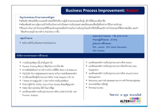 แต่ การควบคุม เพียงอย่างเดียวอาจไม่เพียงพอต่อการแข่งขัน การอยู่รอด และการเติบโตขององค์กร หลักสูตรนีจึงเน้นและให้ความสําคัญกับกระบวนการในการสร้างกลุ่มคนทีจะทํา หน้าทีในการคิดหาวิธีการใหม่ ๆ ด้วยเครืองมือใหม่ ๆ มาใช้ในการปรับปรุง กระบวนการทํางานในทุก ๆ ขันตอนการทํางานในองค์กร เพือสนับสนุนการบรรลุตาม เป้ าหมายขององค์กรในด้านต่าง ๆ ต่อ ๆ ไป Business Process Improvement Kaizen