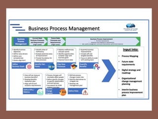 The document profiles Setia A. Wicaksana, an expert in organizational development, business psychology, and human resources. It lists her roles managing consulting firms, associations, and as a professor. The document also summarizes her qualifications, publications, and educational background. It provides an overview of business process management, including definitions, the BPM lifecycle of design, modeling, execution, monitoring and optimization. It gives examples of basic process components and how they are organized in BPMN diagrams.