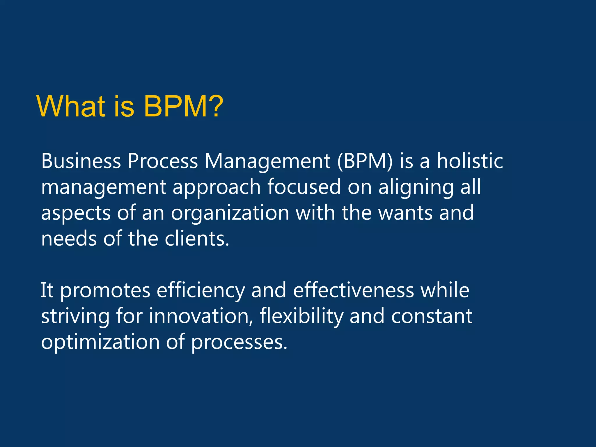 The document discusses Business Process Management (BPM). BPM is a holistic management approach focused on aligning an organization's processes with customer needs. It promotes efficiency, effectiveness, and continuous process optimization. BPM integrates data, documents, human and automated activities to streamline processes. A case study by Deloitte found implementing BPM software at an insurance company increased employee productivity by 70%, reduced processing times by 75%, and cut operational costs by 50% while improving customer service.