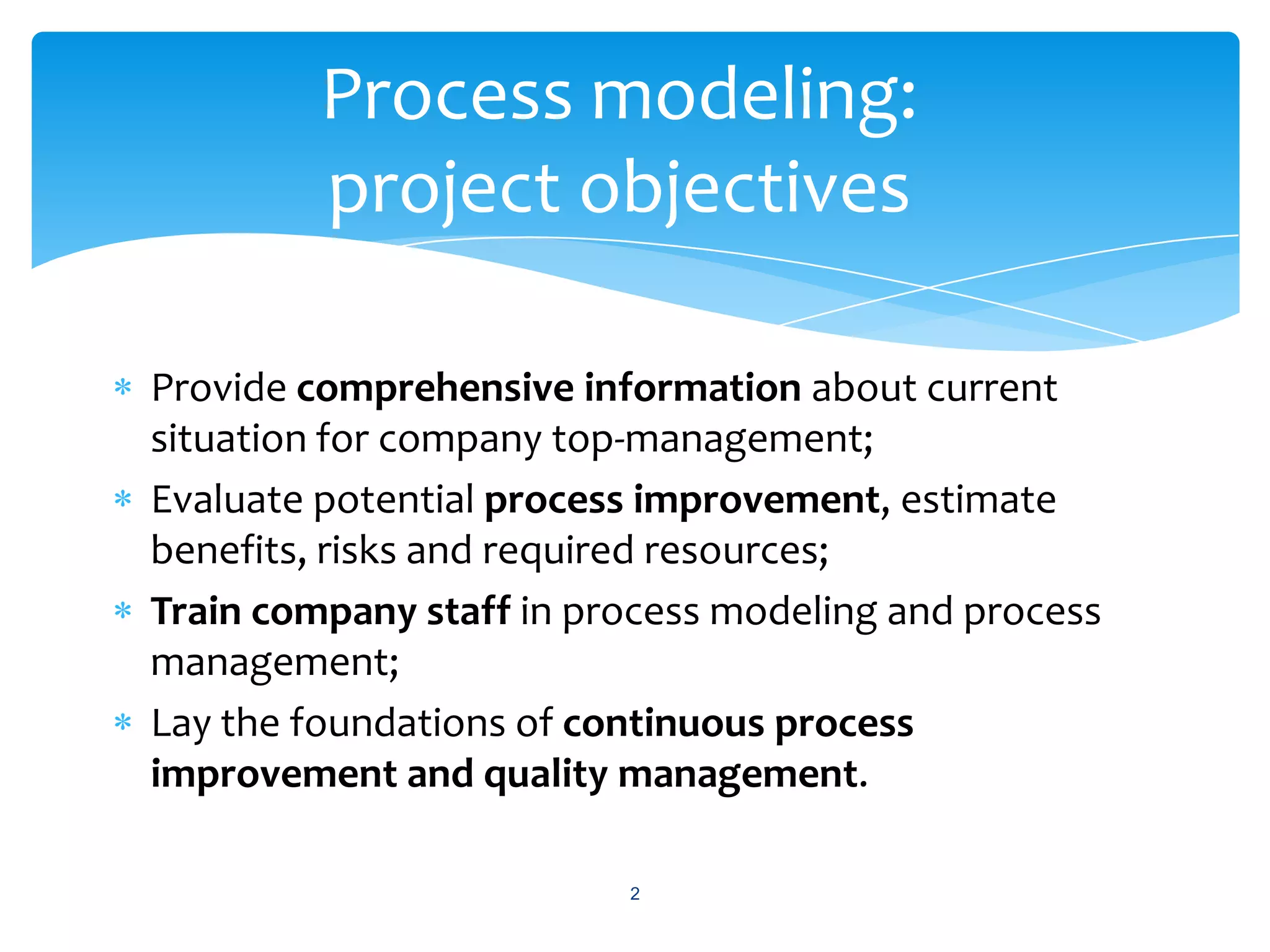 This document discusses process mapping and modeling for a mobile telecom operator. It recommends taking an evolutionary approach to process modeling using basic tools like MS Visio initially. It emphasizes starting with core processes that influence strategic objectives and working with process owners. The document recommends using the eTOM framework to identify processes and map them to the company's organizational structure. It also discusses establishing a process management framework, potential risks, and characteristics of process ownership.