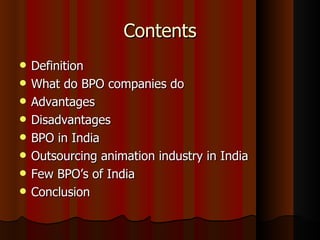 Business Process Outsourcing (BPO) involves companies outsourcing internal functions like customer service, finance, and HR to third-party companies. India is a major hub for BPO due to its large English-speaking workforce and lower costs compared to other countries. Some major Indian BPO companies include TCS BPO, Genpact, WNS Global Services, and Wipro. The animation industry in India is also growing, with companies like Pentamedia Studios and Toonz Animation producing animated films for domestic and international markets. Overall, the BPO industry in India is expected to grow 30% annually and employ over 350,000 people.
