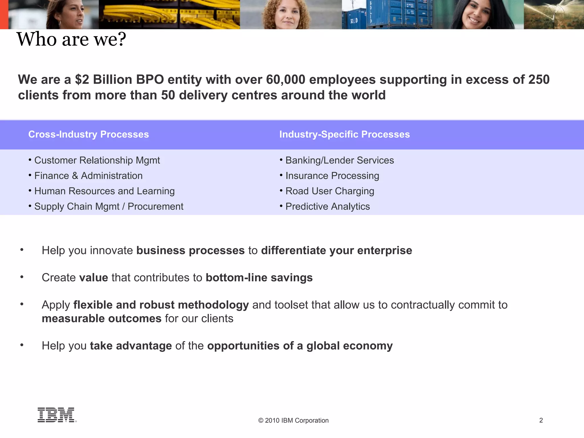 IBM Global Process Services is a $2 billion BPO entity with over 60,000 employees, providing innovative business process solutions to over 250 clients worldwide. The company aims to create operational agility and deliver measurable outcomes across various industries through customer relationship management, finance, human resources, and supply chain management. Utilizing advanced analytics and a balanced-shore approach, IBM optimizes processes to help clients achieve significant cost savings and enhance operational efficiency.