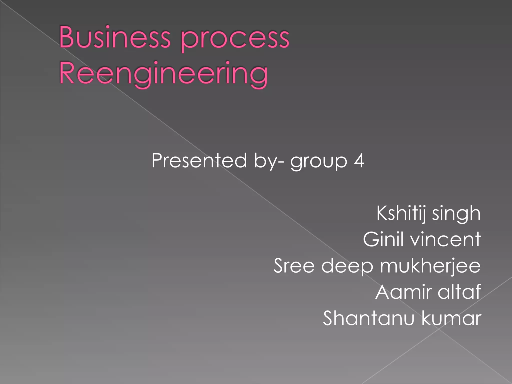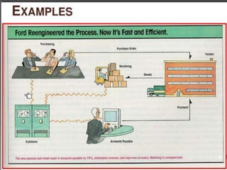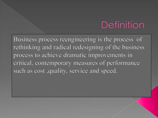 The document discusses business process reengineering (BPR). It states that BPR changes processes, not functions, departments, geographies, or tasks. Reengineering is not the same as reorganizing or downsizing for cost savings. Reengineering focuses on rethinking processes from the ground up to make them more efficient, such as by eliminating unnecessary work. The document then describes how competition from Japanese companies in the US led American companies to adopt Japanese lean manufacturing techniques like just-in-time production and multi-skilling to better respond to customers. An example is given of a 1997 BPR project at a company that reengineered customer ordering, service, and feedback processes.