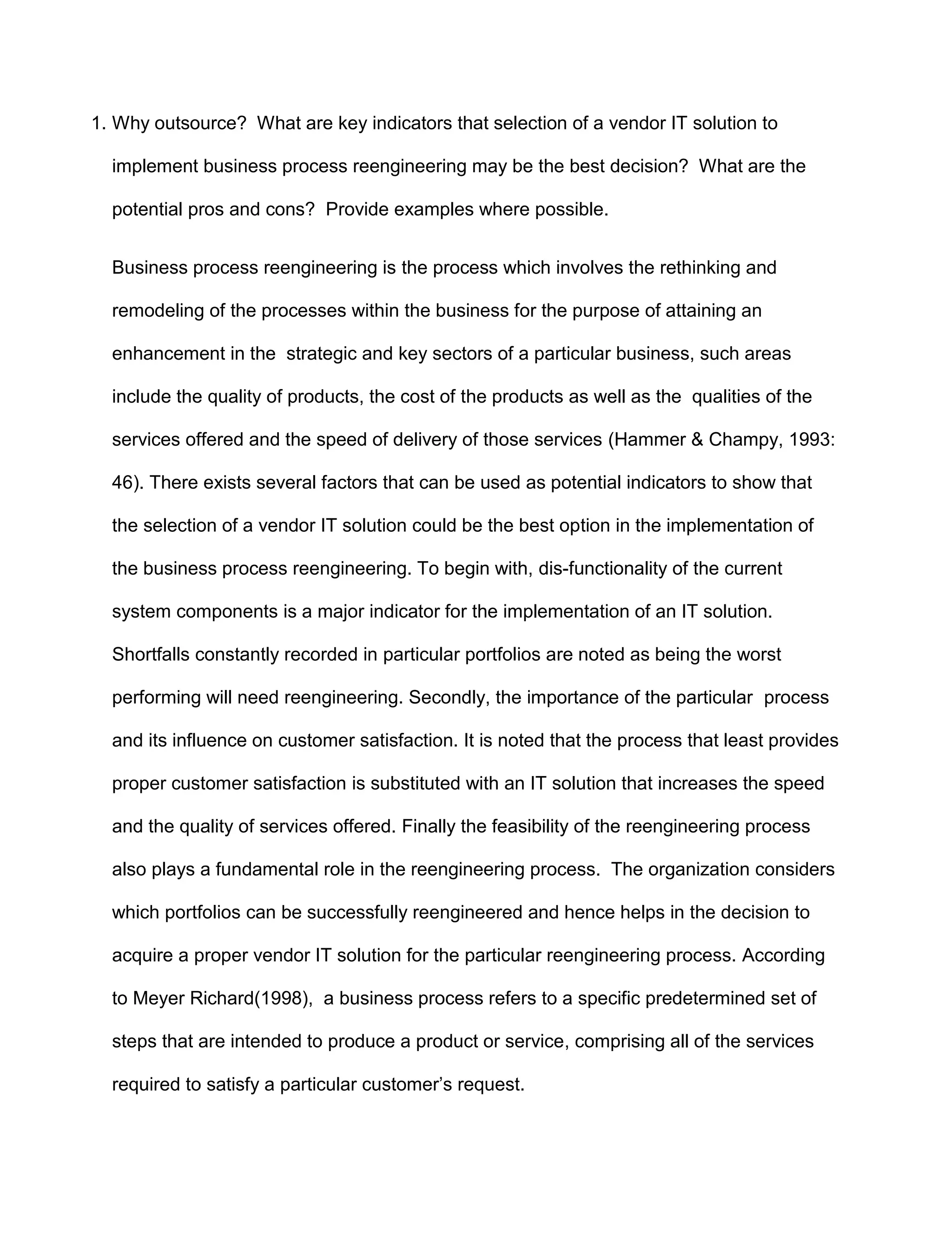 The document discusses several topics related to business process reengineering and IT solutions. It describes key indicators that an IT vendor solution may be best for implementing business process reengineering, such as dysfunctionality in the current system. It also discusses the key strengths of service-oriented architectures for modern businesses, including modularity, reusability, and self-contained services. Additionally, it describes how tools like environmental analysis, SWOT analysis, value chain analysis, and business strategy choice can influence business process reengineering and provides examples. Standards for measuring organizational performance and information systems functions are also rated.